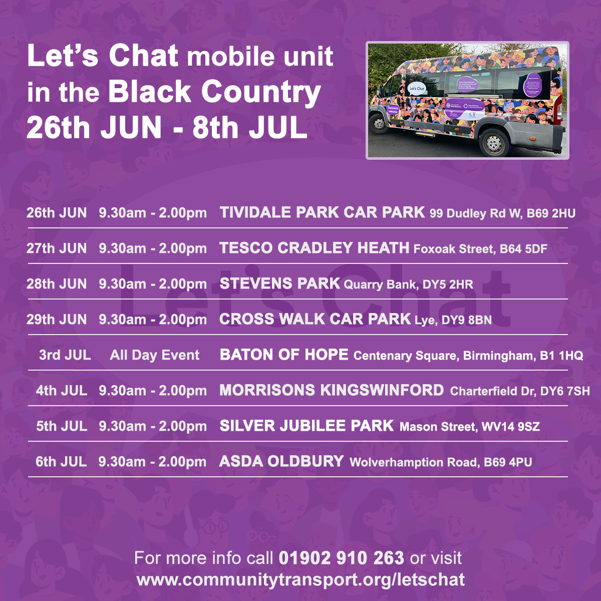 The Let's Chat Bus has released their dates and locations, of where they will be this July across the Black Country. Connecting people through their local community in the aim to tackle loneliness with transport. A great way to meet new friends, getting advice or to finding more about local service and support available to you.