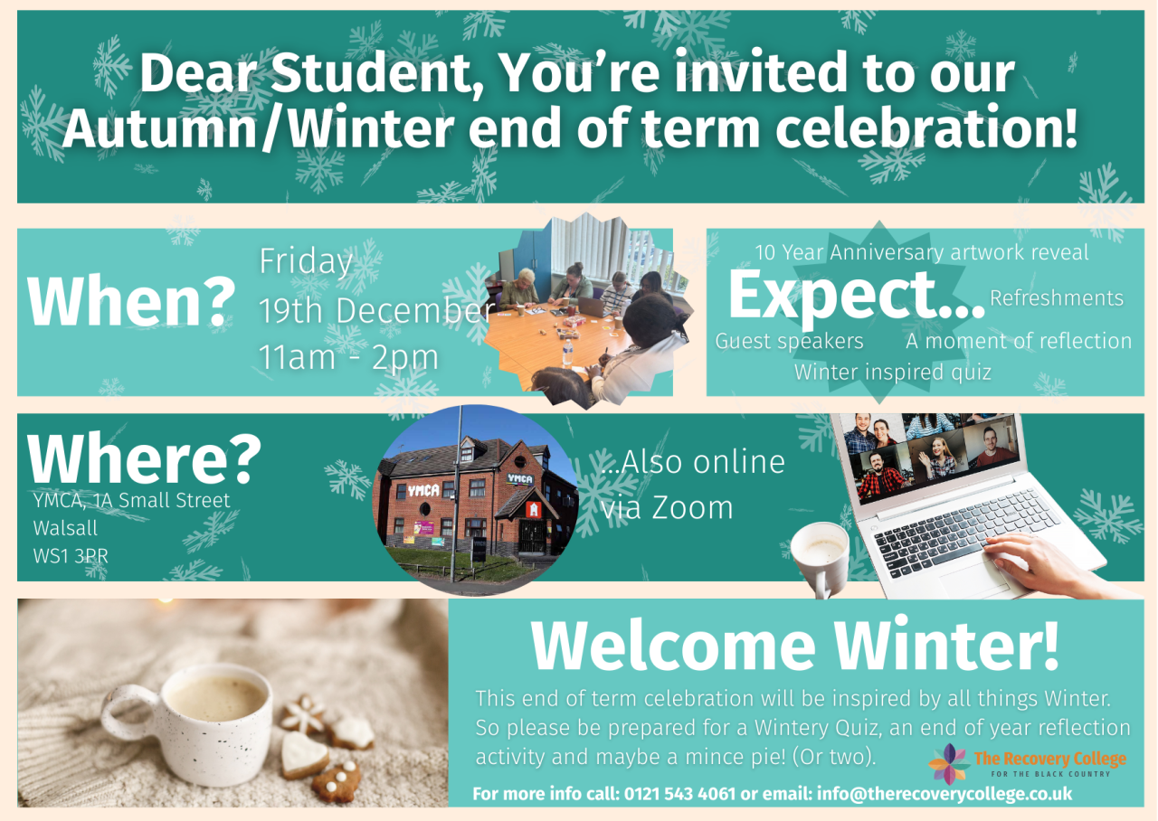 This time we are delivering the celebrations from Walsall Recovery College (YMCA Small Street Day Centre) on 19th December between 11am - 2pm, please let us know if you wish to attend the celebration Face to Face. We are also offering students chance to join us online via Zoom!