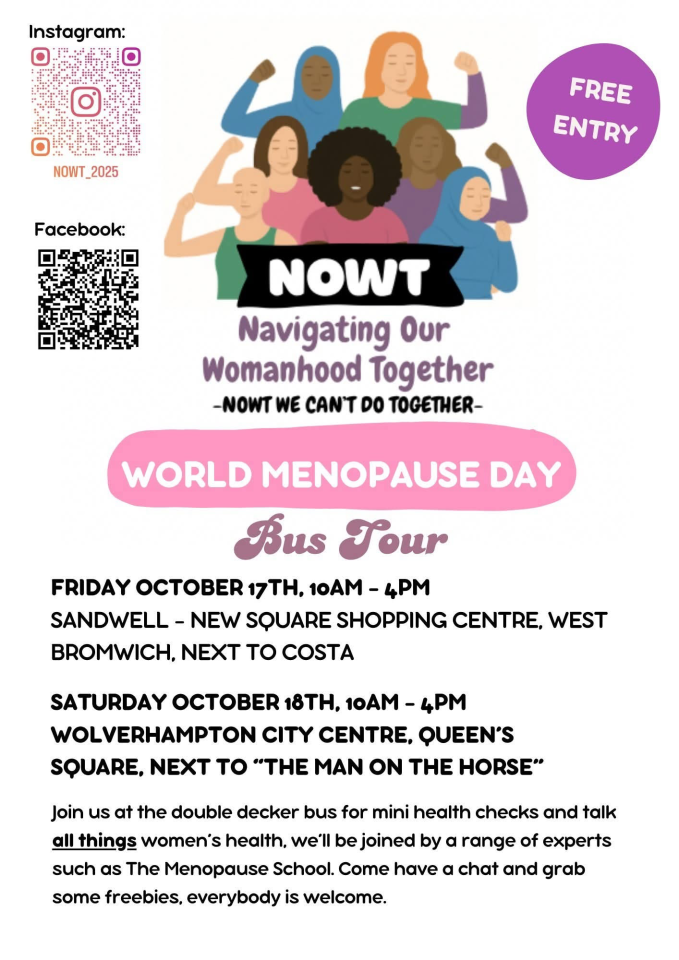 Join NOWT at the double decker bus in New Square Shopping Centre in West Bromwich for mini health checks and talks all things women's health. You will be joined by a range of experts like The Menopause School. Come and have a chat, grab some freebies! Everyone is welcome.